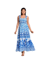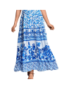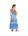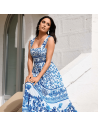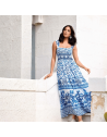 Abito lungo in morbido tessuto di modal con fantasia azzurra floreale su base bianca.