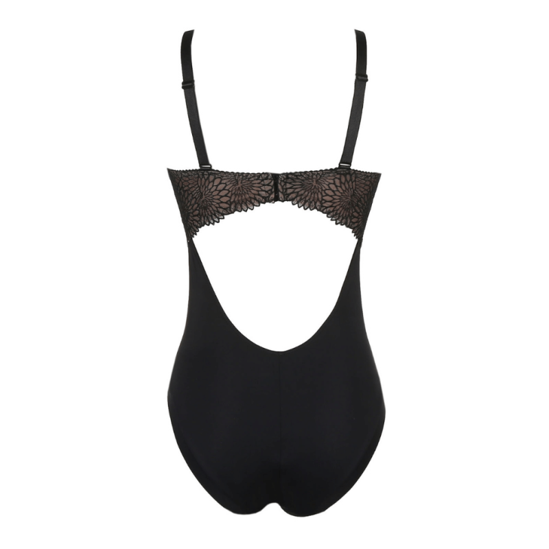 Posteriormente chiusura a reggiseno regolabile su 3 posizioni e sensuale inserto di pizzo.