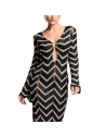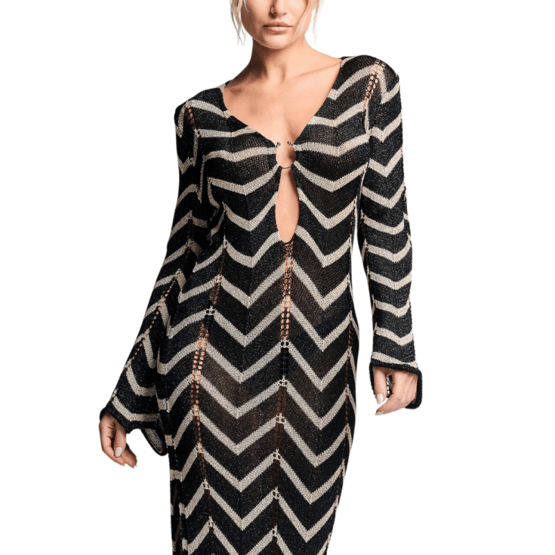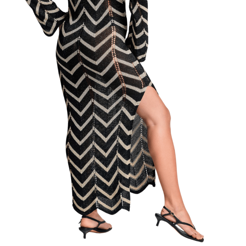 Abito lungo effetto uncinetto traforato a righe nero e oro.