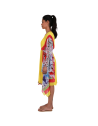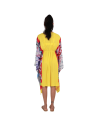 Fantasia floreale astratta nel laterale, accostato alla fascia centrale dell'abito di un bel giallo intenso.