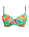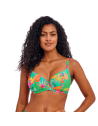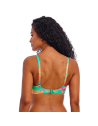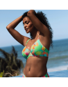 Reggiseno costume da bagno scollato in fantasia tropicale su base verde.