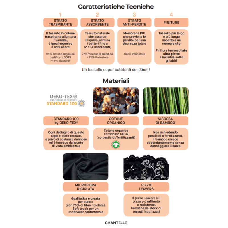 Composizione: tessuto esterno: 75% poliammide, 25% elastan; pizzo: 85% poliammide, 15% elastan; Tassello: strato traspirante 94% Cotone organico GOTS, 6% Elastan; strato assorbente: 77% Viscosa di bamboo, 23% Poliestere; Strato anti-peridite: 100% Poliestere